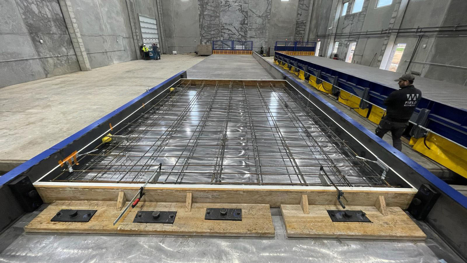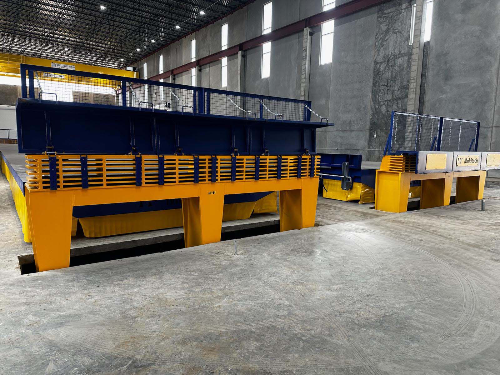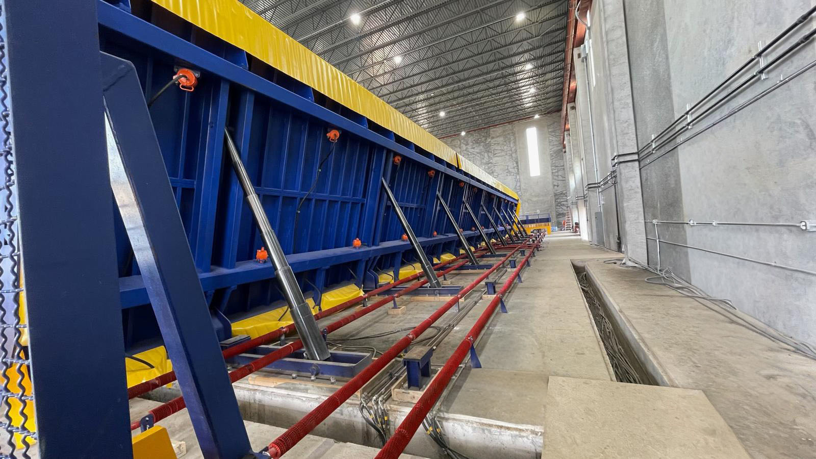 Además, la instalación se complementa con cabezales de tesado en foso, permitiendo trabajar con altas cargas sin transmitir esfuerzos a la estructura de la mesa, lo que mejora la estabilidad del sistema y su comportamiento en producción continua. Estos cabezales permite a nuestro cliente producir tanto paneles pretensados como paneles sin pretensado pudiendo de esta forma acudir a una gran variedad de proyectos.