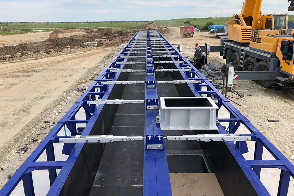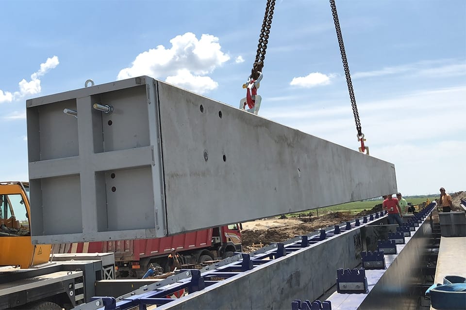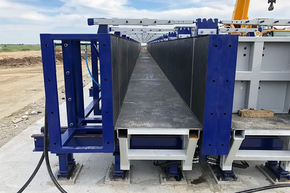 La versatilidad de este equipo, capaz de producir grandes columnas con ménsulas a las 4 caras y de longitudes de más de 25 metros es único en el país y permitirá a nuestro cliente entrar de lleno en el mercado de las grandes obras industriales que se están desarrollando en la zona de Bucarest.