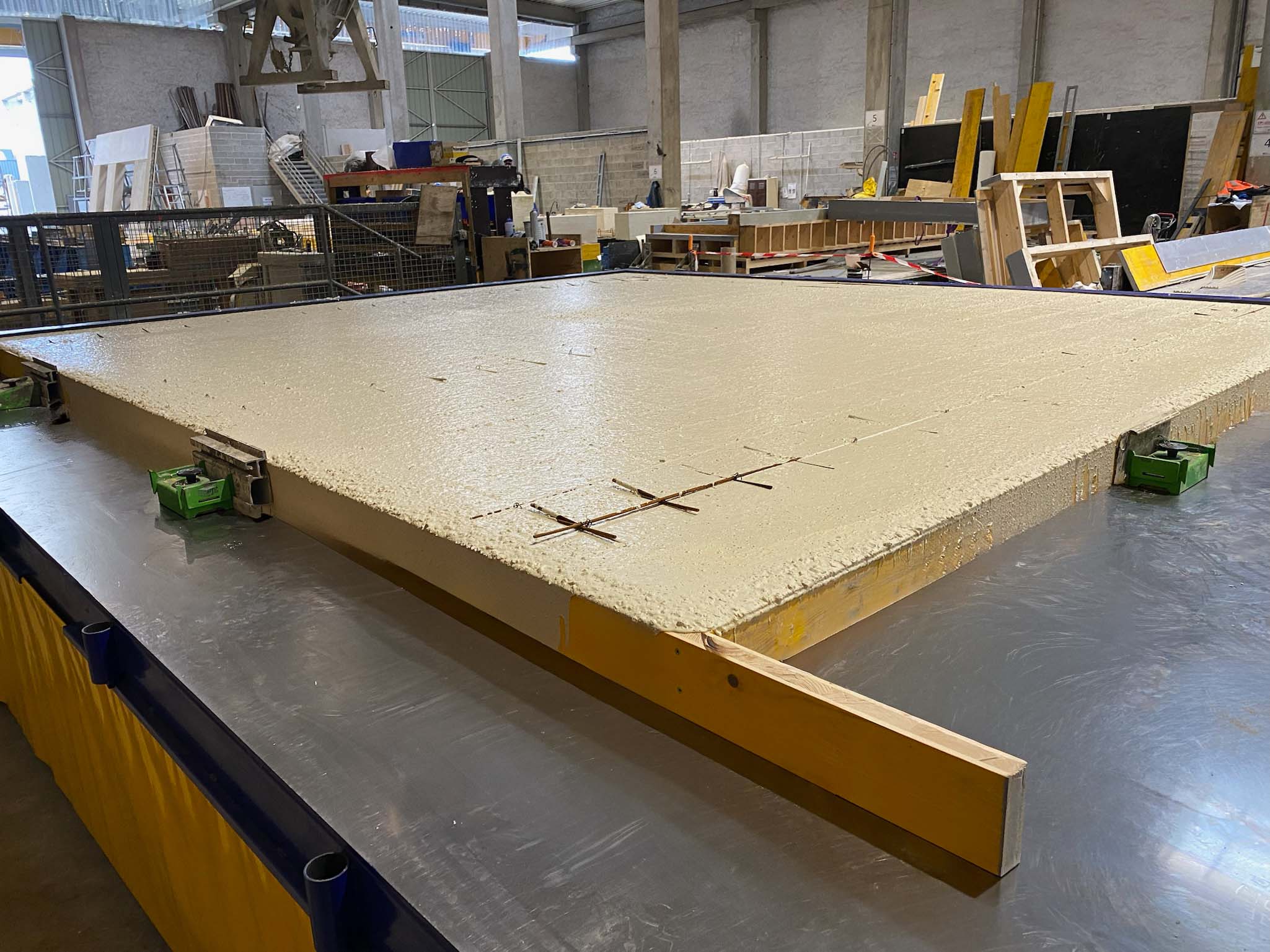 Con una superficie útil de 8,0 m de longitud y 4,5 m de ancho cada una, la instalación permite la producción de paneles con espesores variables entre 150 y 350 mm, con alturas predefinidas que facilitan la organización del proceso productivo y la repetibilidad de las geometrías.