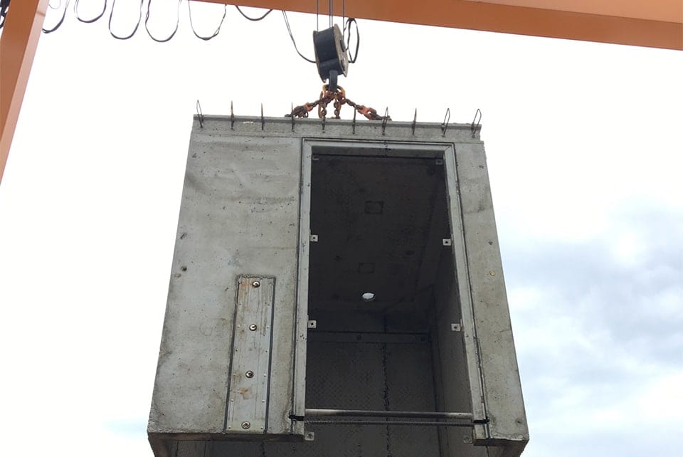 - Herstellung der vier Wände und des Bodens in einem einzigen monolithischen Stück, was eine große strukturelle Festigkeit verleiht und die Montage- und Installationszeiten vor Ort erleichtert.