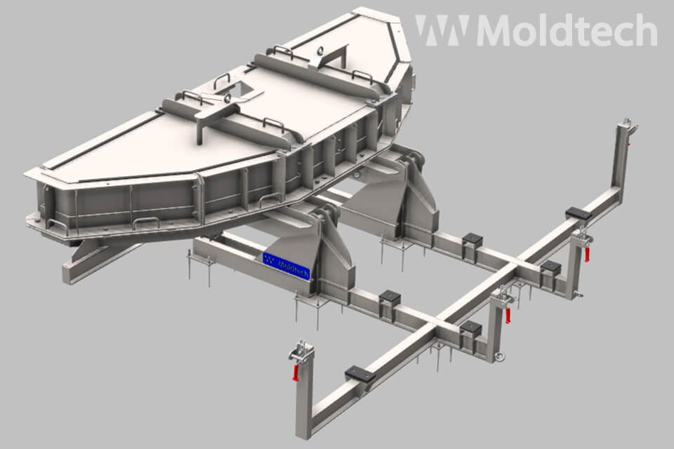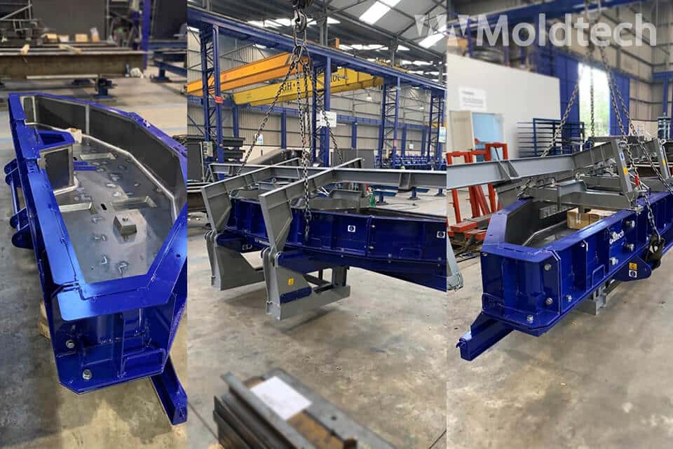 - Besteht aus 4 Teilen, die mit Hilfe von Schraubverbindungen die Geometrie des zu gießenden Teils bilden. Es ist wiederum an einem Rahmen befestigt, der es ermöglicht, es mit Hilfe eines Brückenkrans zum Entformen zu drehen.