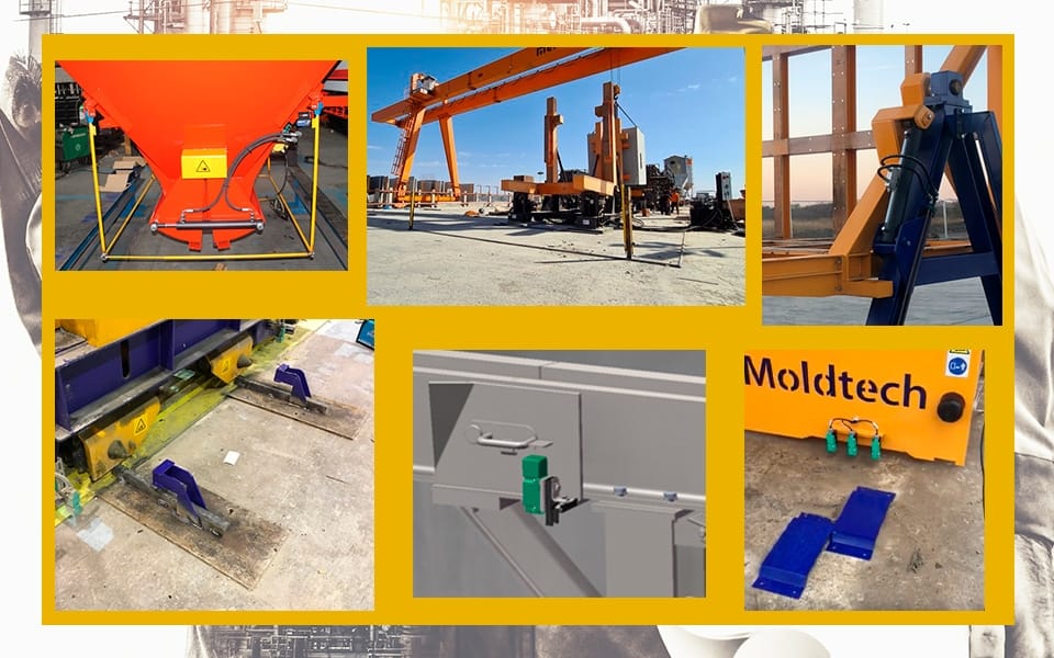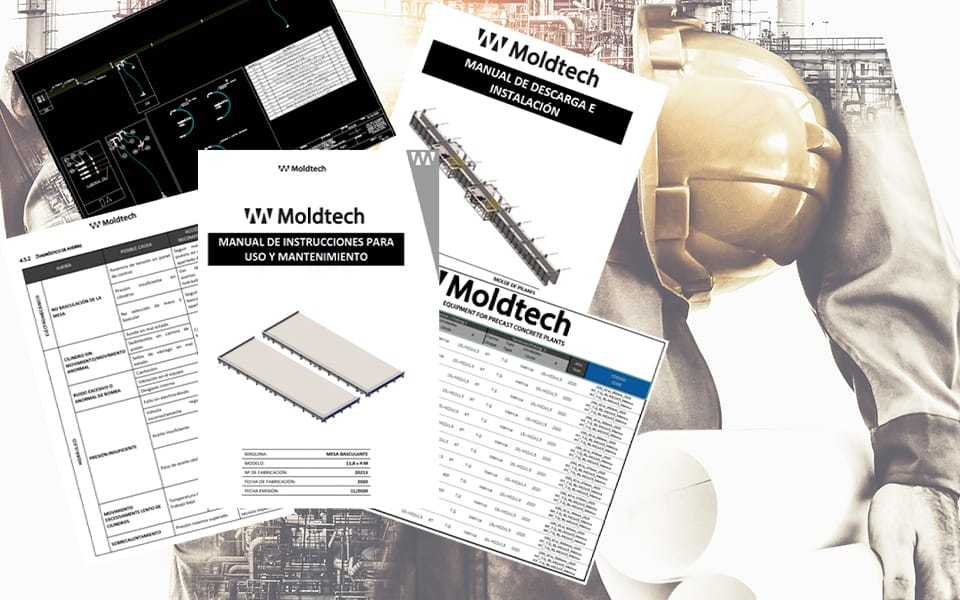 IDENTIFICATION AND SAFETY SOLUTIONS:At Moldtech we provide our own designers, specific printers and special identification and safety professional software and database, which allows us to design and customize our own exclusive labels, signals and tags. These mentioned labels and signals are later installed in our pre-stressing equipment, our tilting tables and in many other moulds and products. Likewise, our complete manuals which are also supplied with the machine, provide to the customer a detailed analysis of all the components used in the machine, the potential necessary spare parts for the correct maintenance of the machine, and the appropriate certificates.