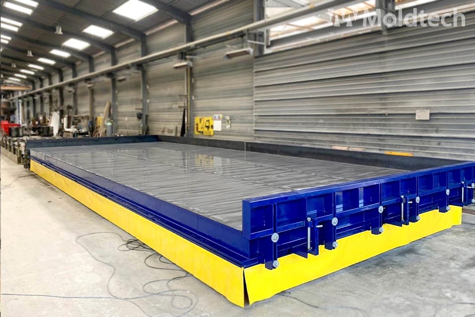 French precasters normally use the fixed tables as a general casting surface where all kinds of different concrete elements are cast using magnetic shuttering. These elements can be architectural, structural or façade elements. It is for this reason that PREFA BRESSUIRAIS also bought from Moldtech a fixed table. This table, with a size of 13.5 x 5 meters and a load capacity of 750kg/m2, features lateral shuttering of 30cm height and offers great versatility for the production of flat and linear concrete elements.