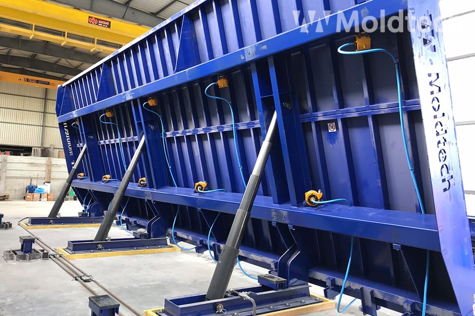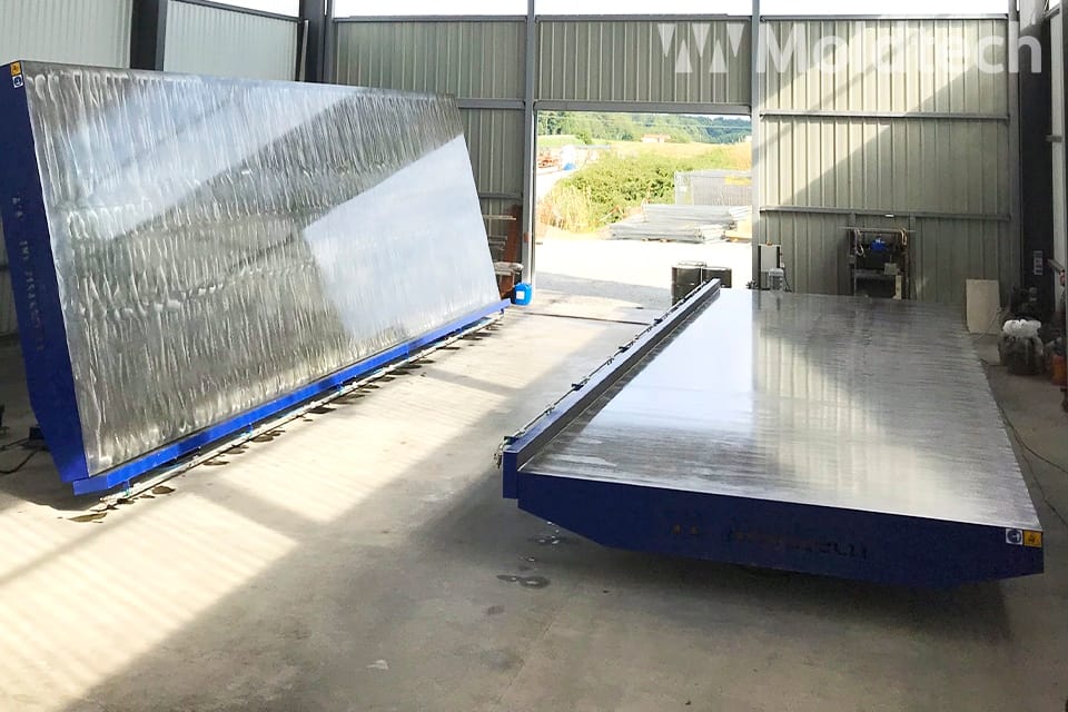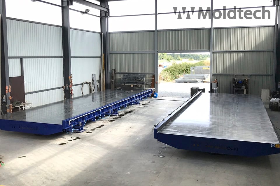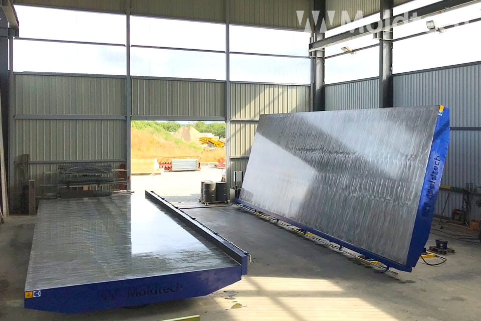 Moldtech has designed, manufactured and installed two 12×4 m tilting tables, with an adjustable lower side that allows to produce panels up to 30 cm thick. The tilting tables have a vibration system with pneumatic vibrators.