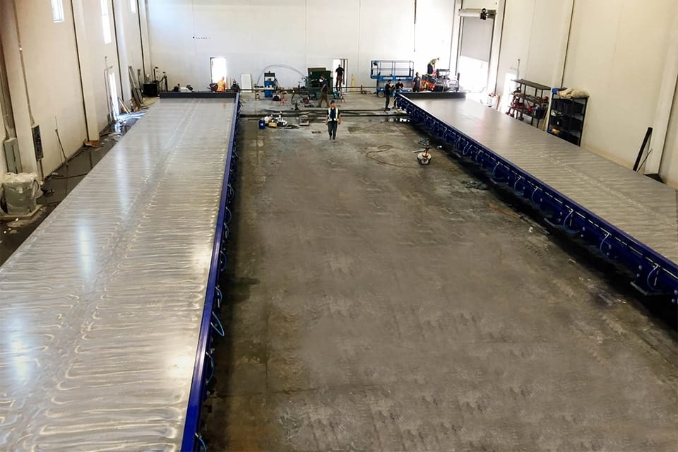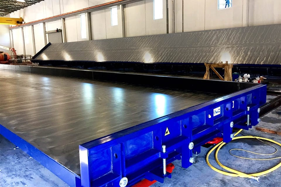 La dimension des tables (34 x 4 mètres) est pensée pour tirer le meilleur rendement de l’espace disponible et optimiser le lay-out de l’usine. Les tables sont conçues pour réaliser des panneaux isolants jusqu’à 30 cm d’épaisseur. Elles sont fournies avez des bandes inférieures et latérales lesquelles sont réglables en hauteur. De même, pour assurer un bon compactage du béton, les tables sont équipées d’un système de vibration pneumatique. Il se compose de 21 vibrateurs stratégiquement situés dans la partie inférieure de la table. Également dans la partie inférieure de la table se trouve le système de chauffage au moyen de tuyaux à ailettes connecté à la chaudière à eau chaude. L’ensemble est livré avec l’unité hydraulique, apte pour contrôler le mouvement de basculement des deux tables.