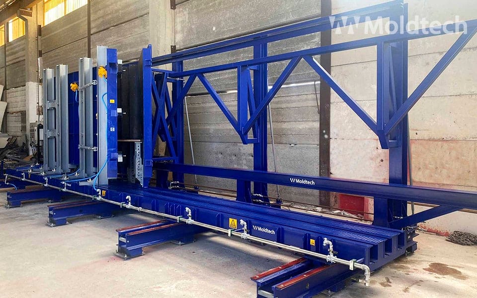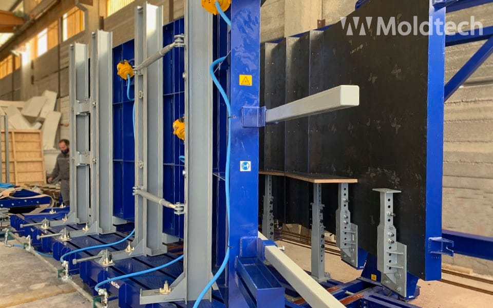 Le moule dispose d’un système d’ouverture / fermeture utilisant des vérins hydrauliques et la taille des marches est réglable manuellement au moyen de broches et de planches de coffrage phénoliques, avec des dimensions maximales et minimales.
