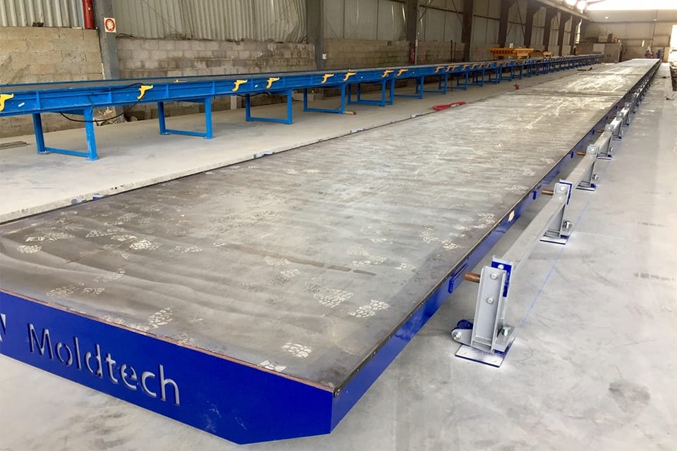 Comme dans toutes les tables fixes fournies par Moldtech, la tôle en contact avec le béton auto plaçant a été polie, ce qui garantit une finition parfaite de la face exposée du béton préfabriqué.