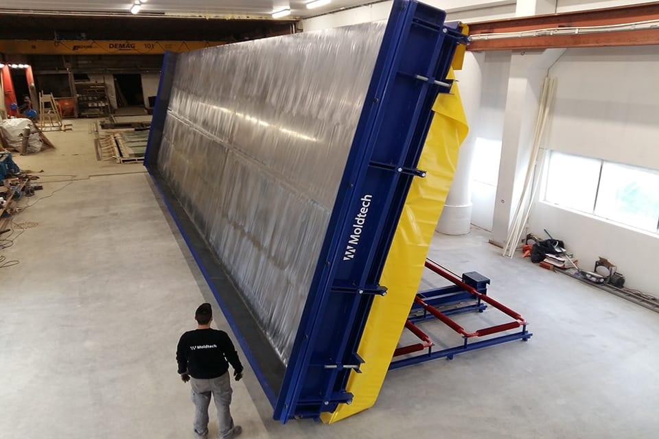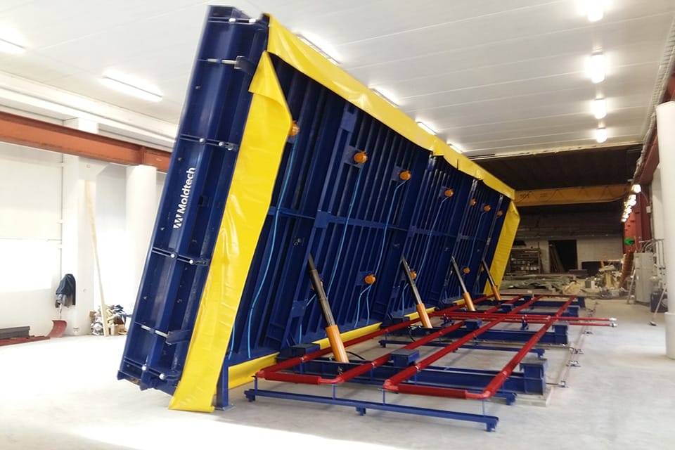 En 2017, Moldtech a déménagé à Oslo, en Norvège, fournissant à ce pays européen des tables basculantes pour la fermeture des panneaux. Dans un endroit aussi froid que cette région norvégienne, le processus de durcissement du béton prend généralement plus de temps, surtout en hiver. Cela augmente la possibilité de dommages lors du levage horizontal du panneau préfabriqué et nécessite également de masquer manuellement les marques des mécanismes de levage sur la surface du panneau préfabriqué.
