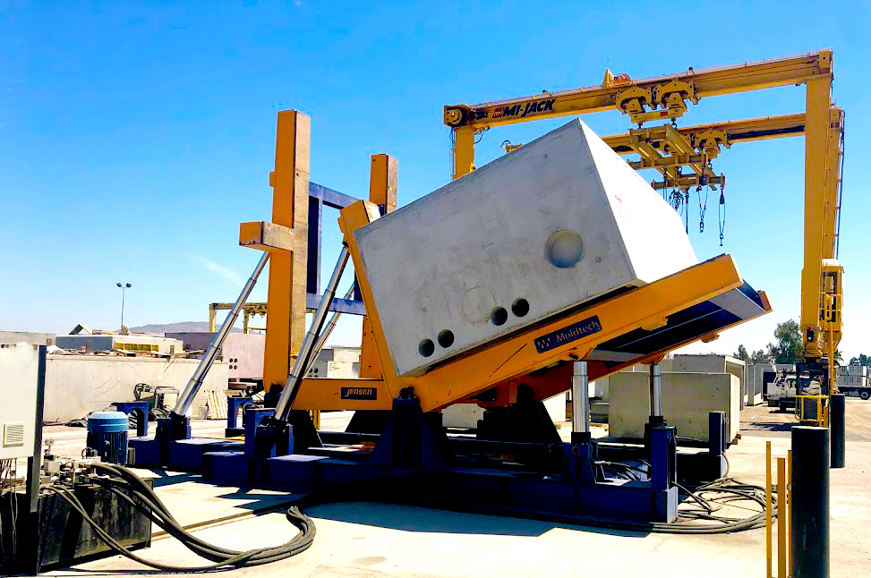 El volteador está diseñado para girar 90º piezas 3D (marcos y semi-marcos) de hormigón prefabricadas, desde la posición de moldeo hasta la posición final de colocación en obra.