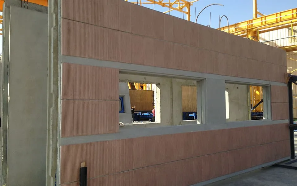Una vez que la parte del panel hormigonada horizontalmente alcanza la resistencia suficiente (alrededor de 9 Mpa) podemos inclinarla y moverla contra la sección vertical del molde y finalmente verter el hormigón en la parte del panel colada verticalmente. Esta parte del panel colada verticalmente suele ser la parte portante del panel. El grosor total del panel puede variar de acuerdo con los requisitos de aislamiento y carga del panel sándwich.