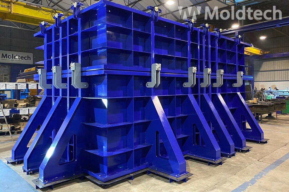 - Normalmente las alcantarillas tienen un chaflán y los huecos de ascensor no, por lo que Moldtech diseñó un ingenioso Sistema en el que los elementos de las esquinas pudiesen sustituirse para que con el mismo molde se pudieran hacer esquinas con chaflanes y esquinas rectas.