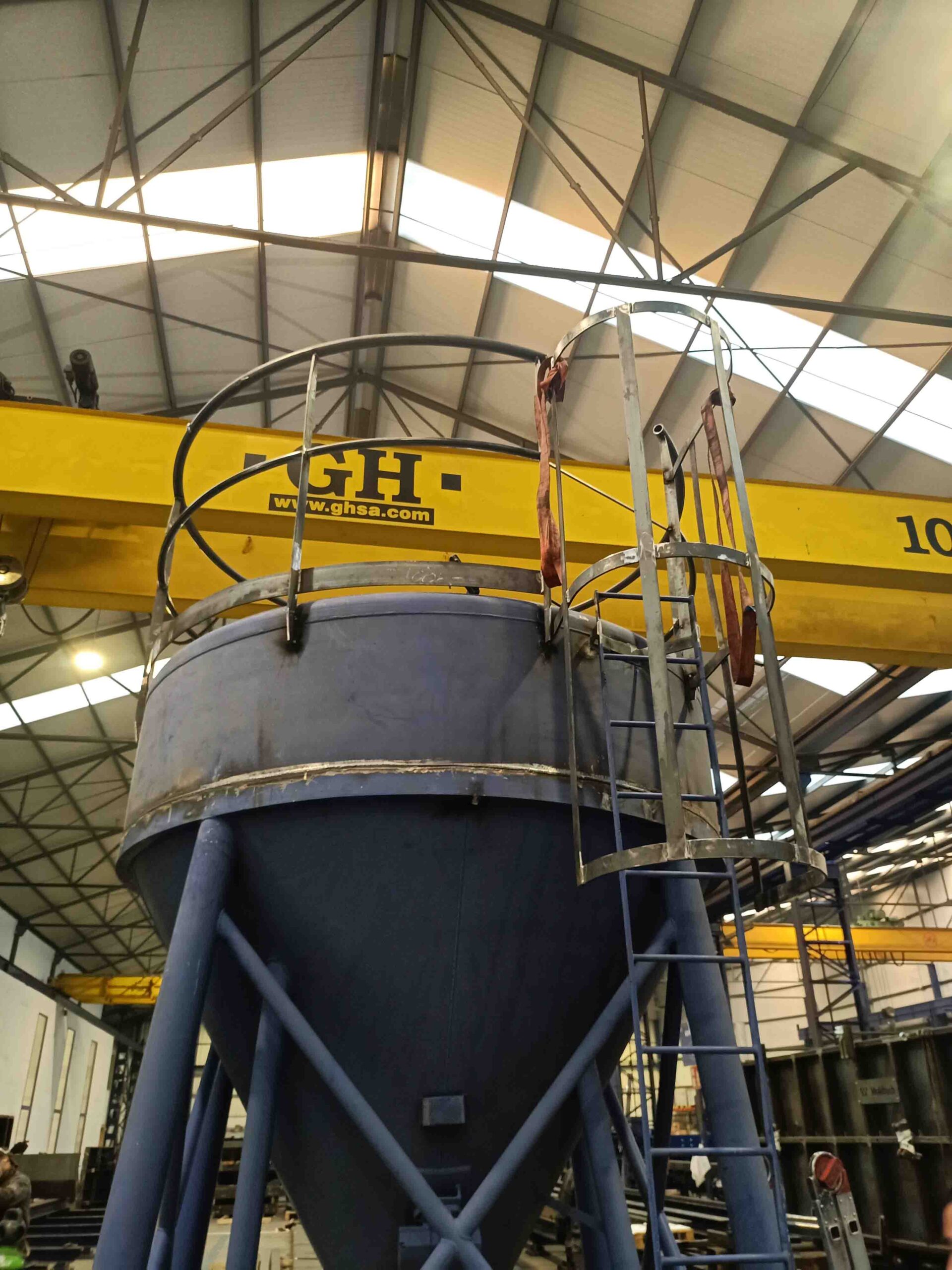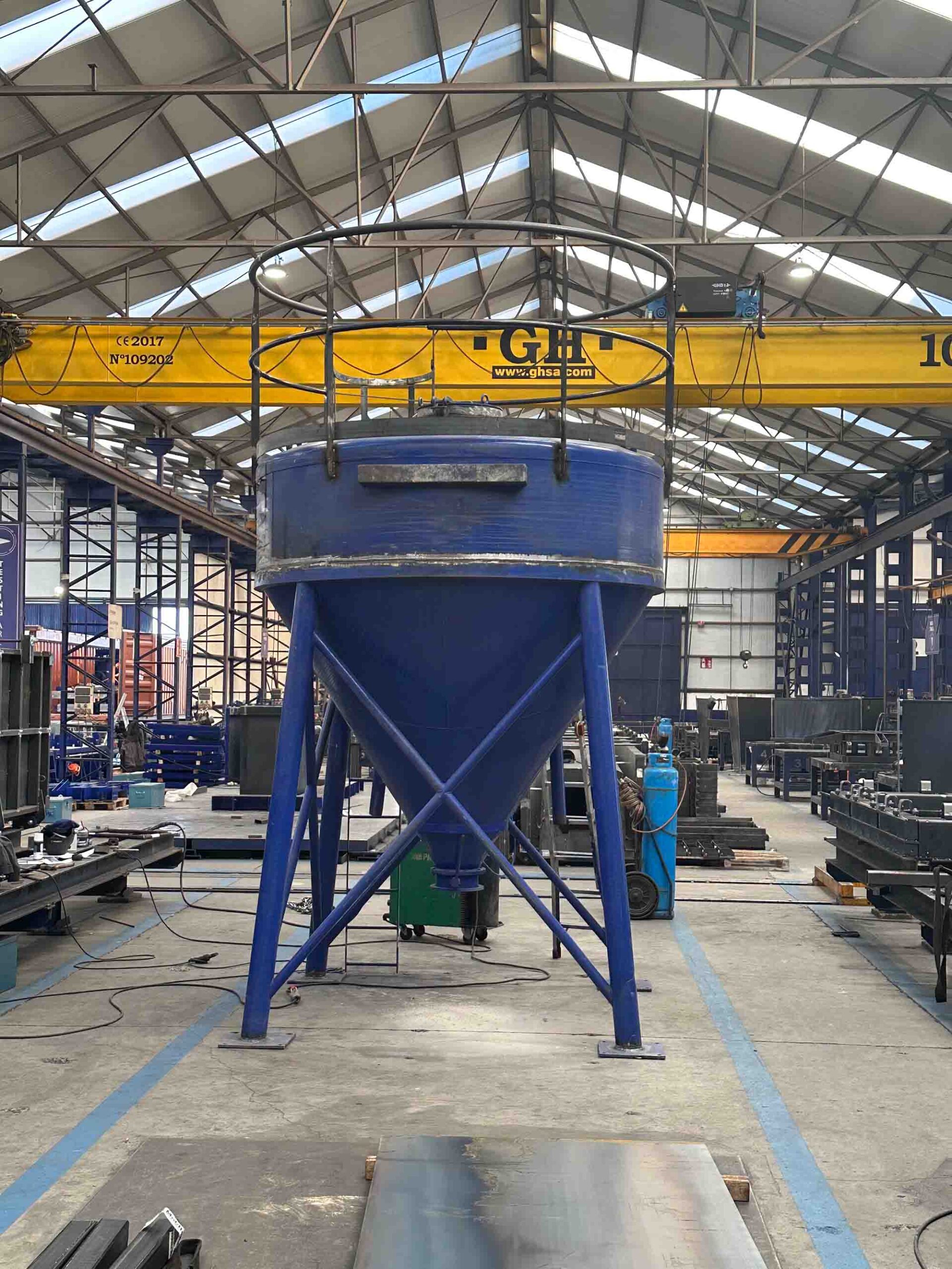 Este equipo está concebido para el almacenamiento temporal de cemento, áridos u otros componentes, permitiendo su descarga controlada por gravedad hacia la siguiente fase de producción. Su configuración, con cuerpo cilíndrico superior y cono inferior, garantiza un flujo continuo y homogéneo del material, mientras que la estructura elevada aporta estabilidad y facilita su integración con sistemas de dosificación o mezclado.