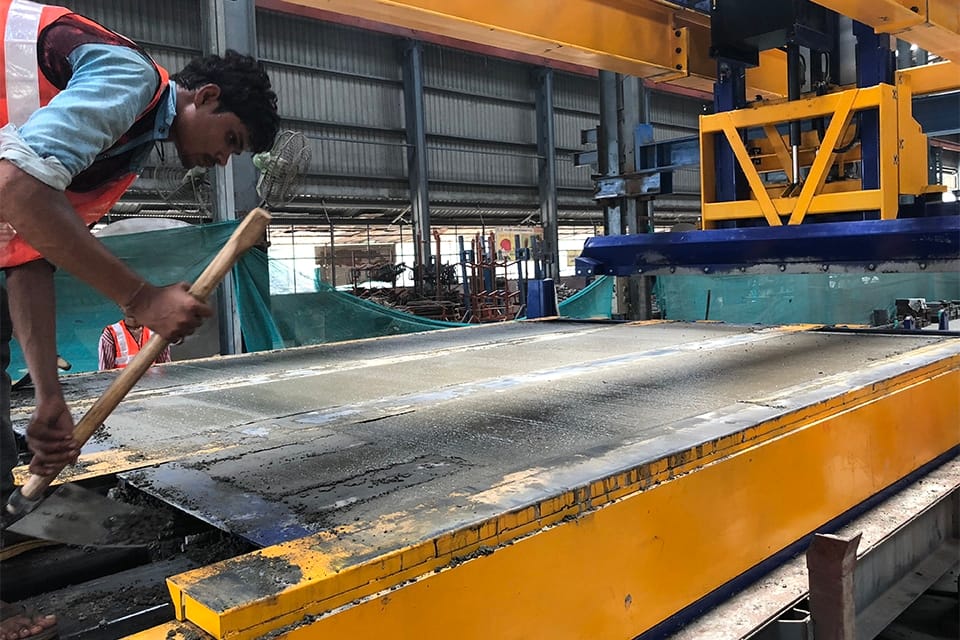 The production of this factory is used for a government program for social housing which objective is to eradicate the existence of slums. The use of moulds for precast concrete elements allows the Indian government to construct a large quantity of houses in a relatively short time. The Narela factory builds 15,000 apartments per year.