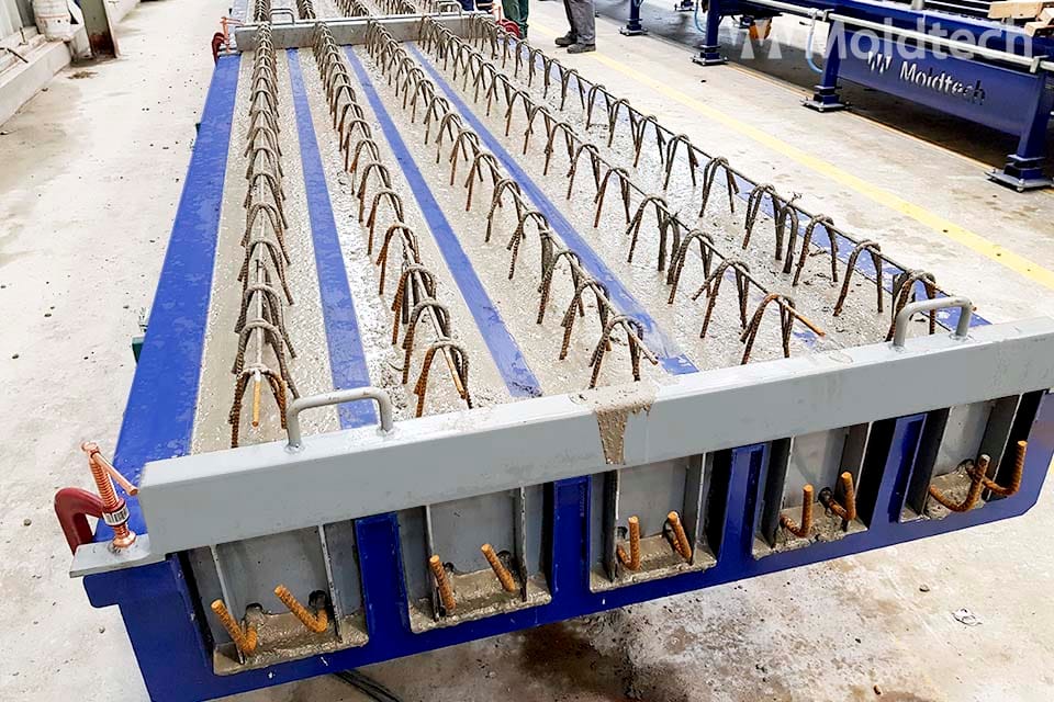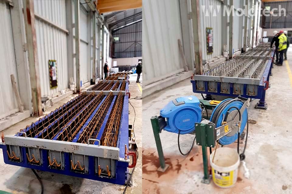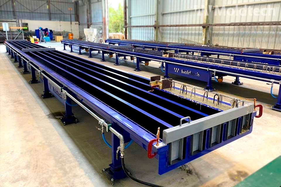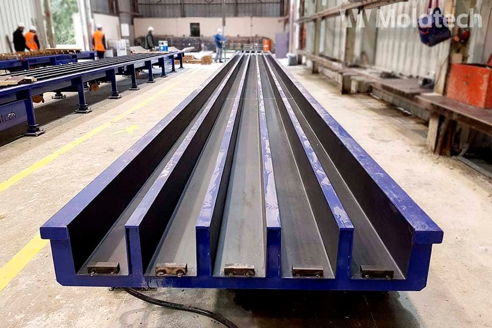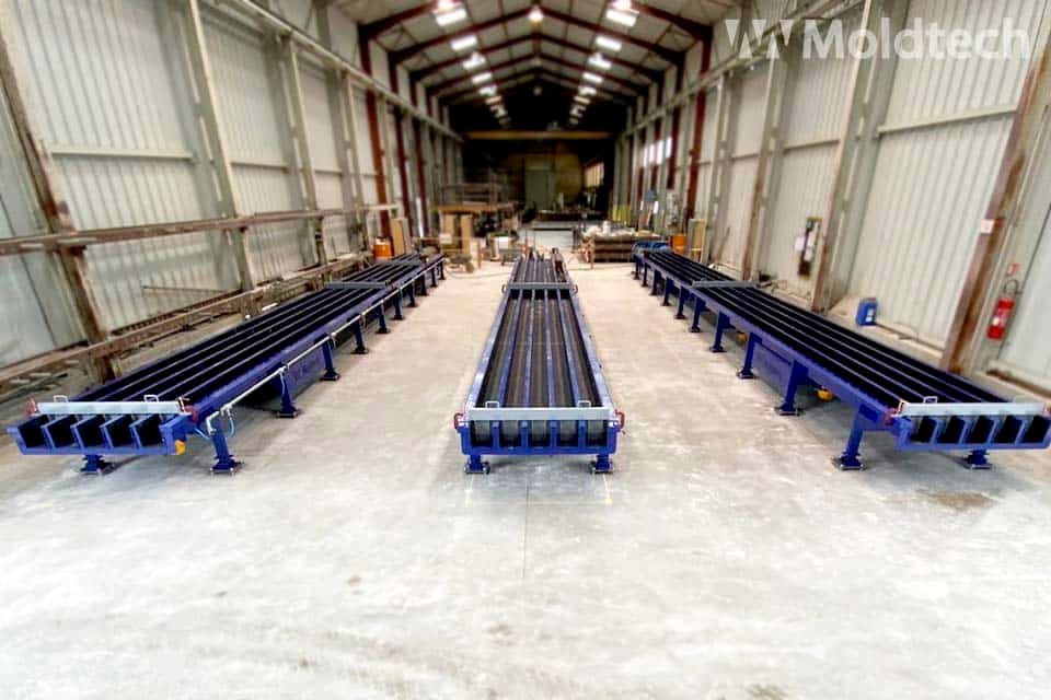 This project includes the manufacture, installation and assembly of 3 tables with multiple production lines of 20×20 cm section beams, with static reinforcement, and with a minimum conicity that allows demoulding. The quality of the surface of the beams is very important for the customer, and that is why all the surfaces of the mould in contact with the concrete have been polished, which added to the installed pneumatic vibration system and the high quality of the concrete produced by the client allows to obtain a final product of a very high quality standard. These beams are sold on the French market to support T-beams slabs, intended for residential construction and single-family homes.